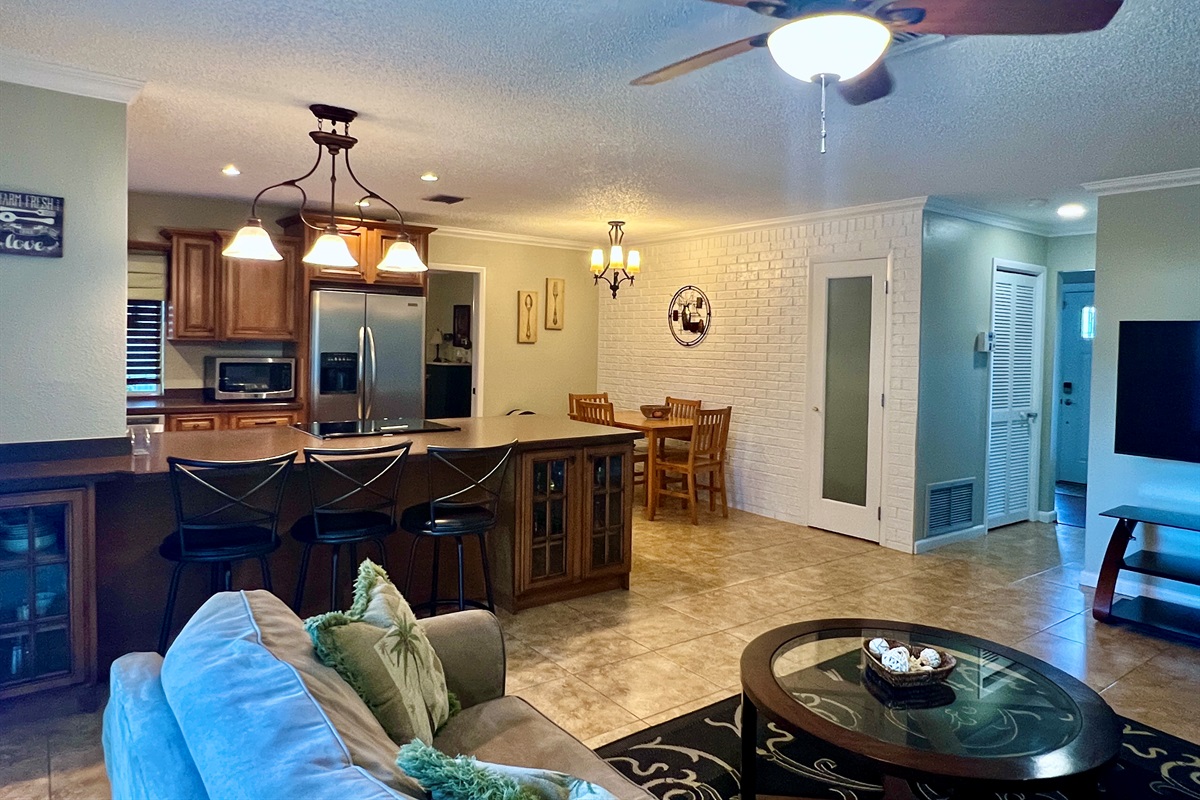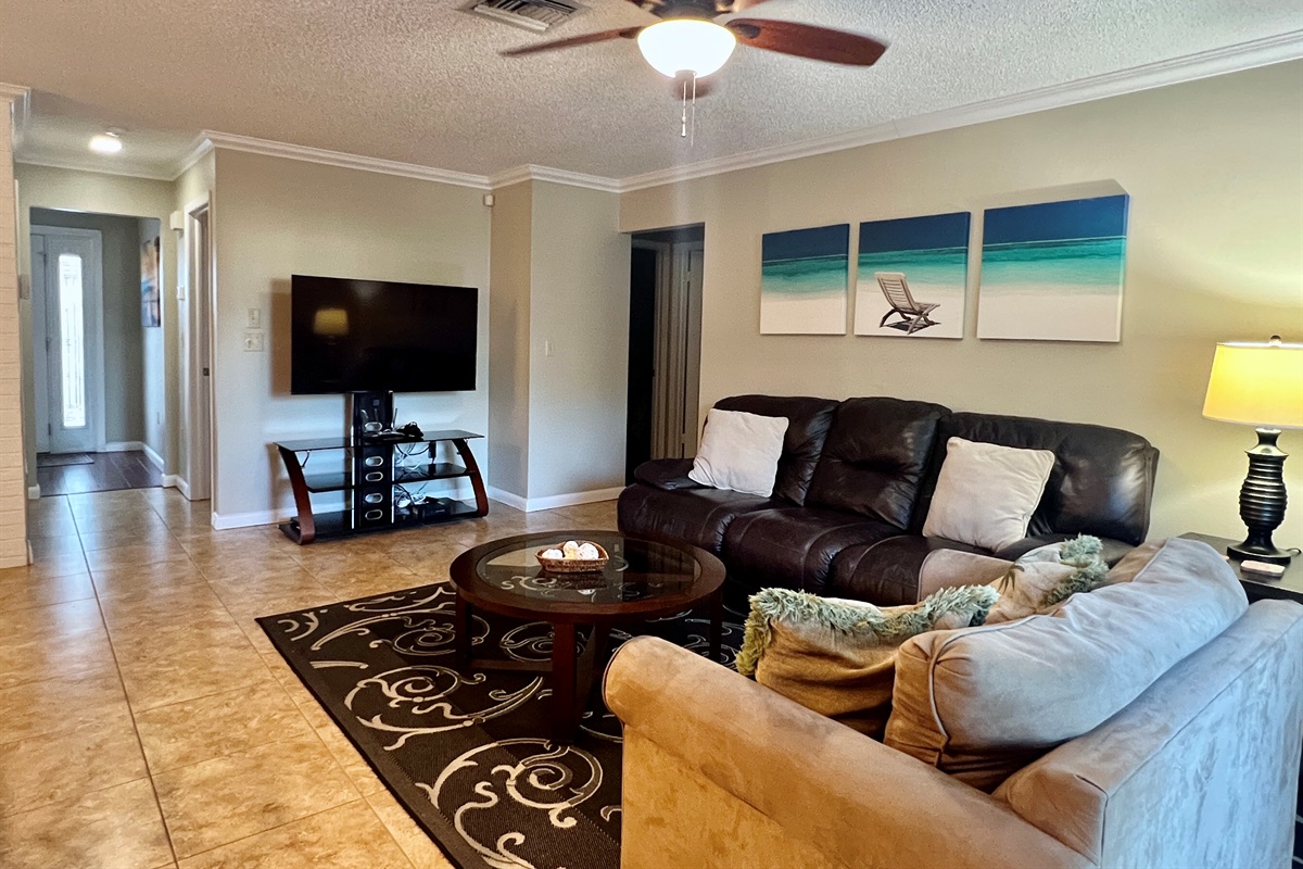 Split floor plan with 3 Spacious Bedrooms. Queen bed in Master. 2nd bedroom - 1 queen bed, 3rd bedroom - 2 full size beds. Family Room room that opens to the fully stocked eat-in kitchen. Separate 2nd living room with a queen size sleeper sofa. Beautiful new pool with spacious covered lanai with lots of seating and outdoor tv.